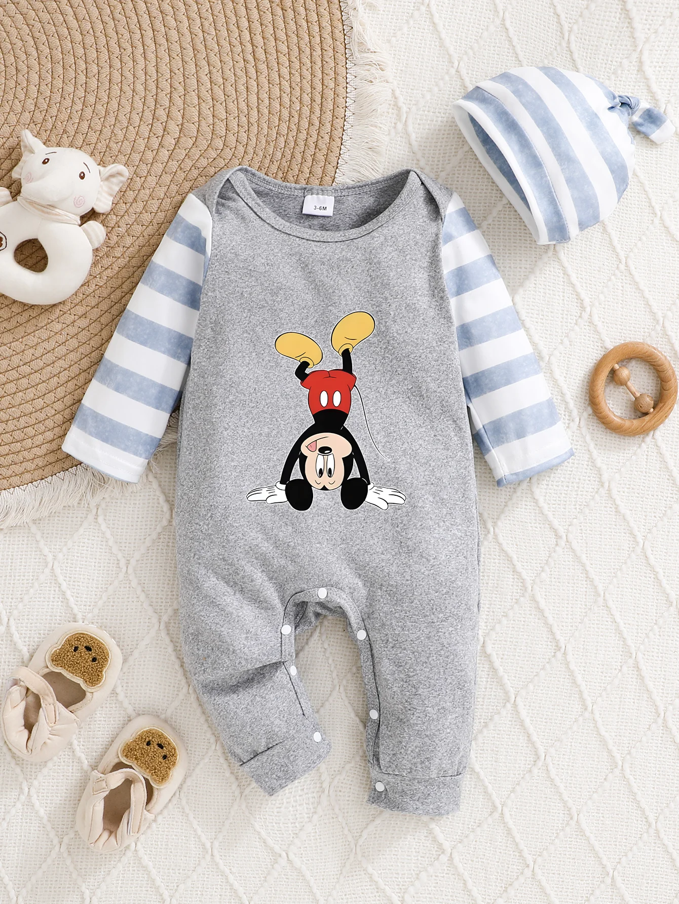 【Ufficialmente autorizzato】 Tutina con cappuccio per neonati Disney "Mickey Mouse": stampa con maniche raglan a righe e posa giocosa in equilibrio sulle mani