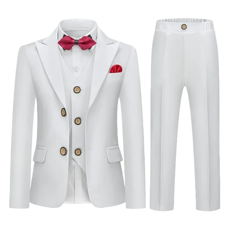 Completo da smoking slim fit per bambini e ragazzi, con blazer, gilet, pantaloni e papillon, ideale per matrimoni e occasioni formali