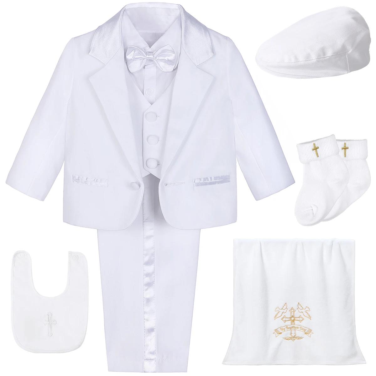 Baby Boy battesimo vestito neonato bianco battesimo vestito con cappello bambino matrimonio festa di compleanno abbigliamento smoking a maniche lunghe 5 pezzi