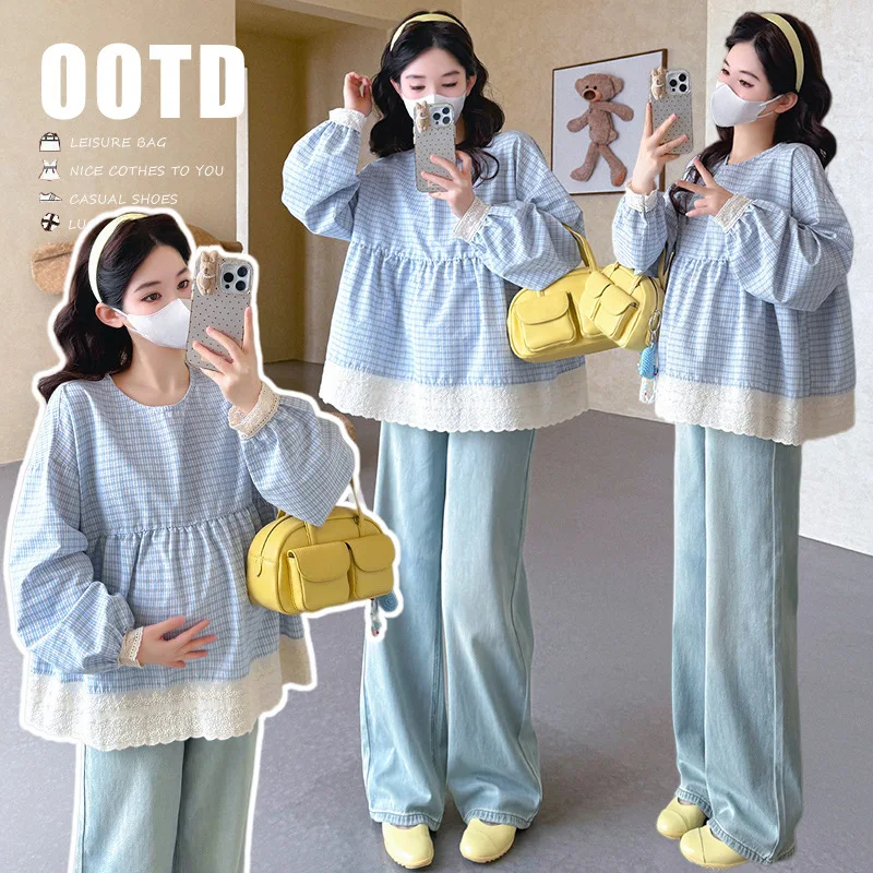 Camicetta Premaman Primavera Autunno Blu a Quadri con Collo Rotondo, Maniche Lunghe a Lanterna, Inserti in Pizzo, Vita Impero, Stile Bambola, Dolce e Carina 2026
