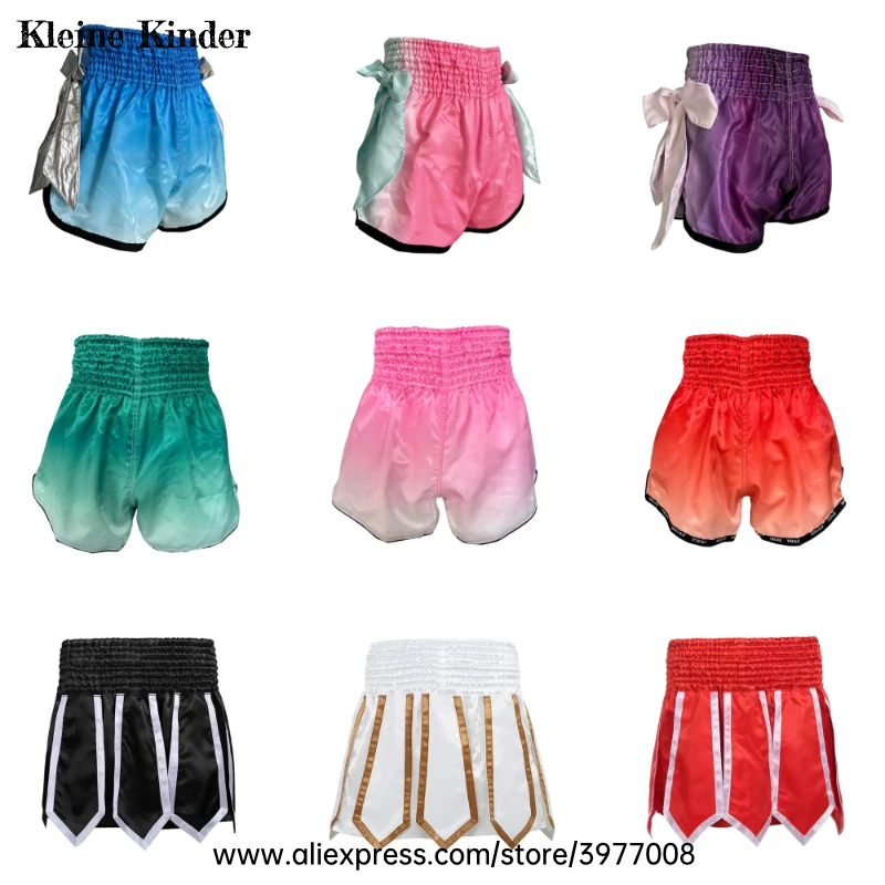 Muay Thai Pantaloncini Fiocco Nastro Gradiente Pantaloncini da boxe Donna Uomo Bambini Kickboxing Lotta Tronchi Palestra Wrestling MMA Pantaloni Bowknot