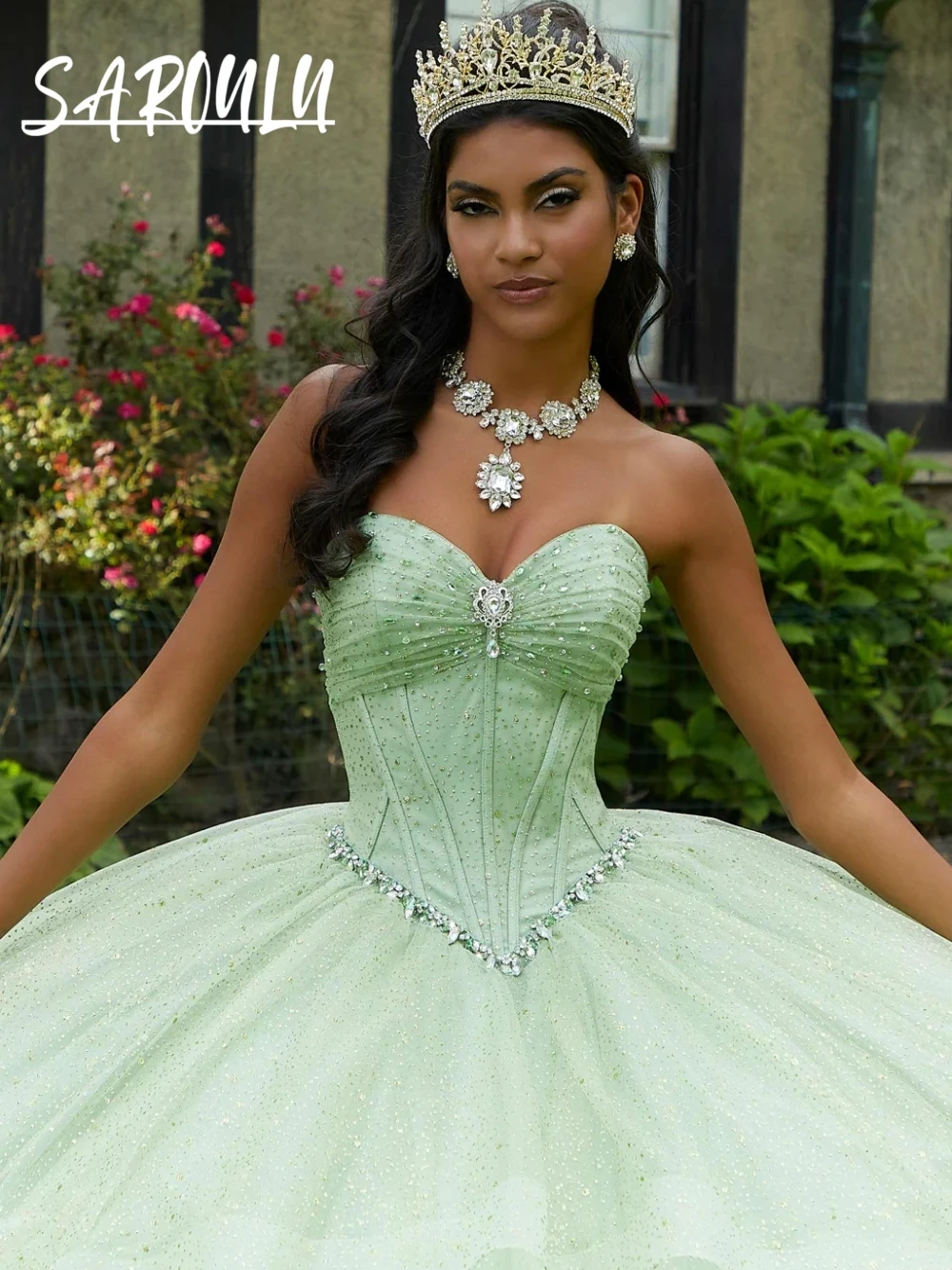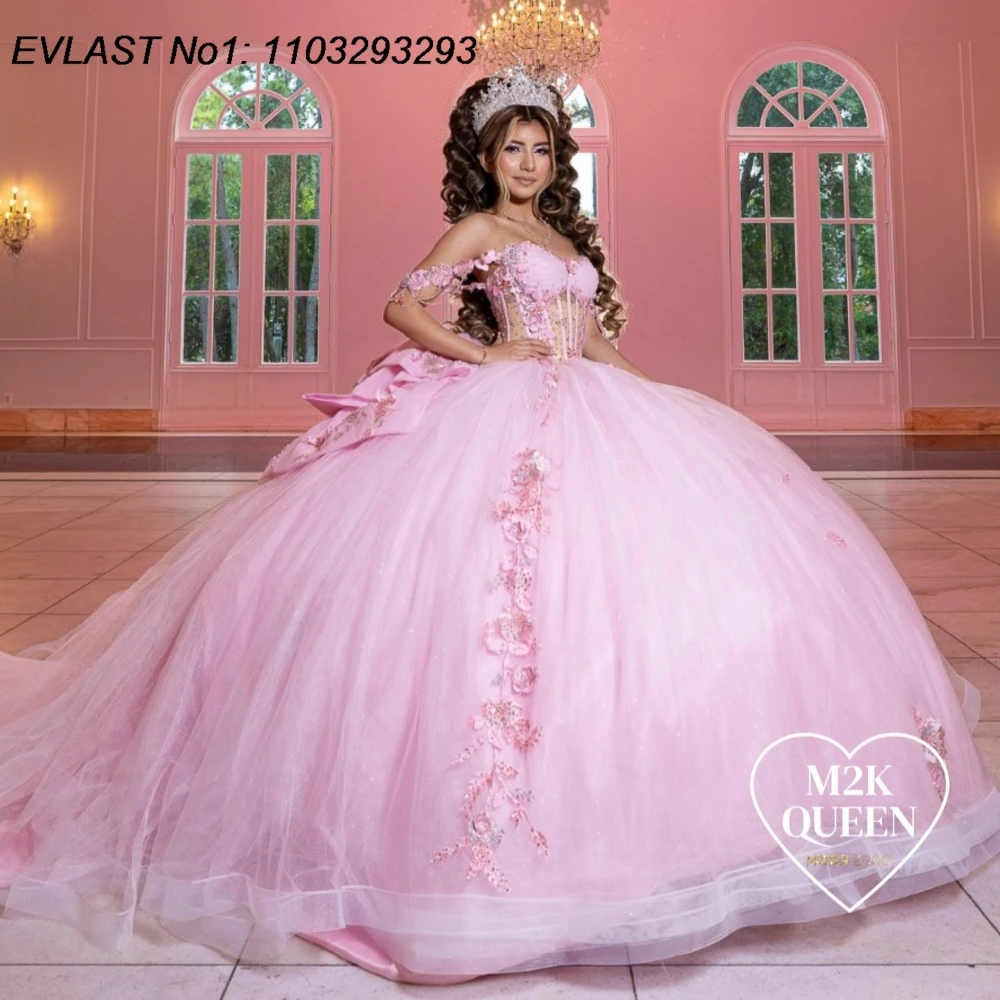 EVLAST Abito da Quinceañera Personalizzato Rosa Glitterato, Vestito da Ballo con Applicazioni Floreali e Cristalli, Vestidos De 15 Anos AQ114