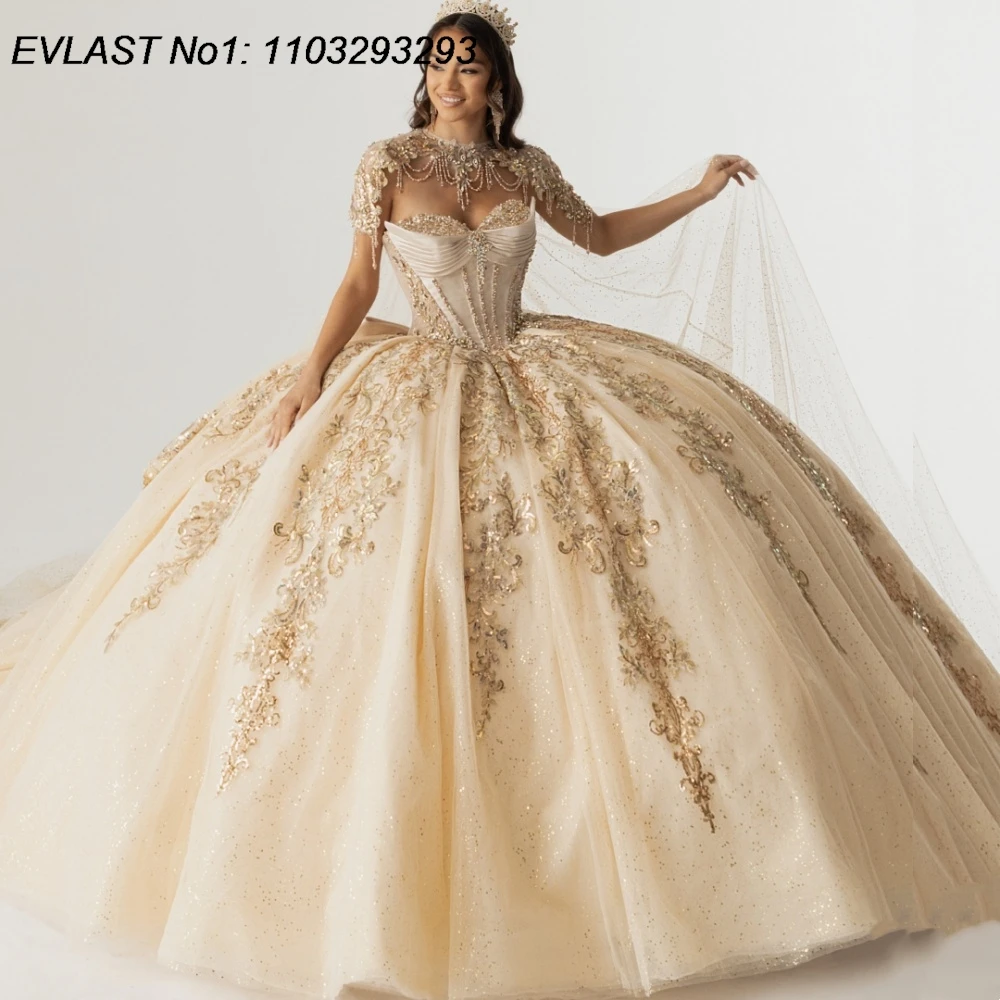 EVLAST Abito da Quinceañera Personalizzato Lucido Color Champagne, Vestito da Ballo con Applicazioni in Pizzo Dorato e Perline, Mantella per Festa dei 16 Anni, Vestidos De 15 Anos AQ127