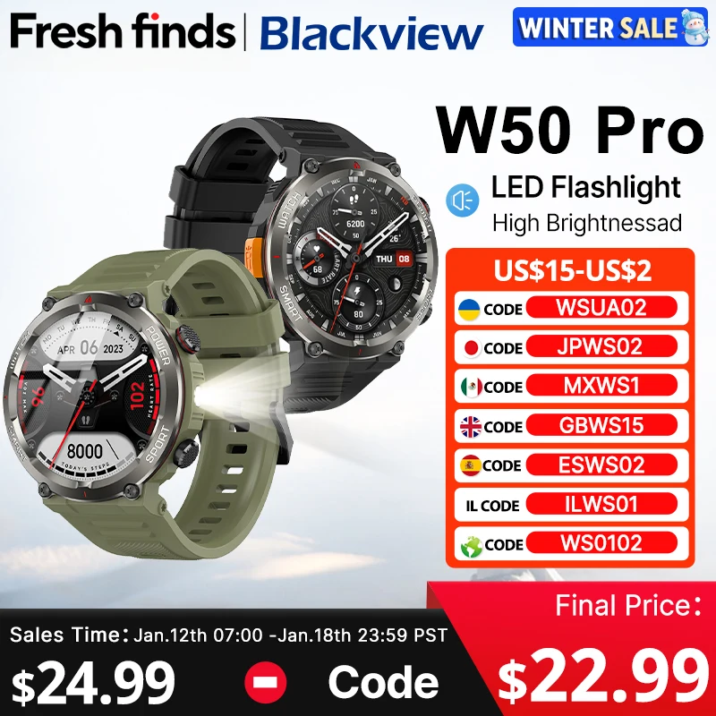 [Anteprima mondiale] Smartwatch Blackview W50 Pro Display HD da 1,45" Torcia Bluetooth Chiamata telefonica Batteria da 960 mAh Smartwatch robusto