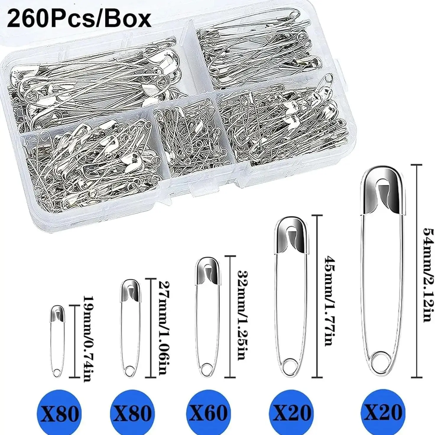 Kit di spille di sicurezza argentate con scatola portaoggetti per cucito, creazione di gioielli e accessori fai-da-te per artigianato.