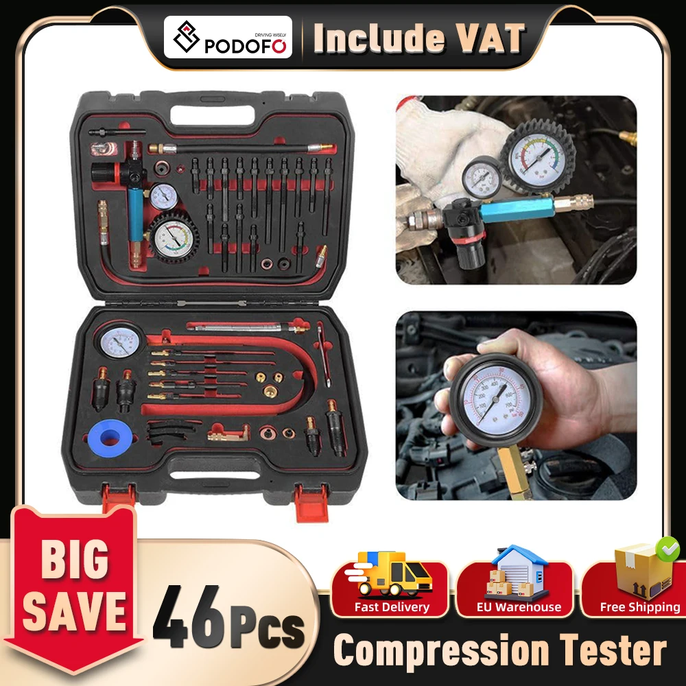 Podofo 46PCS Tester di compressione per veicoli diesel e benzina Tester di perdita di pressione Tester motore Kit tester di perdite per bombole automatiche
