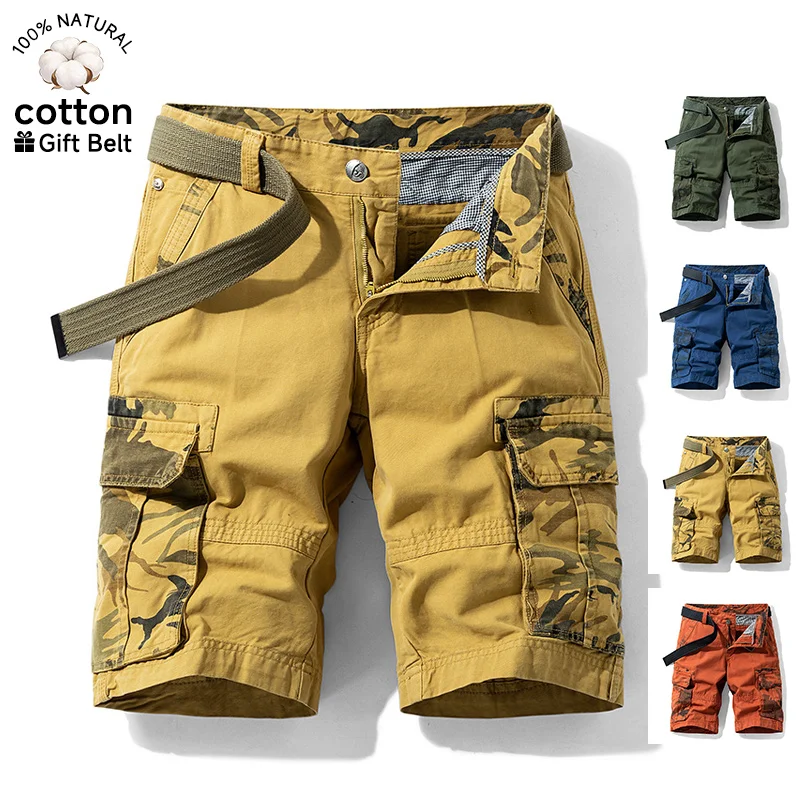 Pantaloncini Cargo Estivi da Uomo, Larghi e Dritti, al Ginocchio, Multitasche, in Twill di Cotone 100% Kaki Mimetico, con Cintura in Omaggio