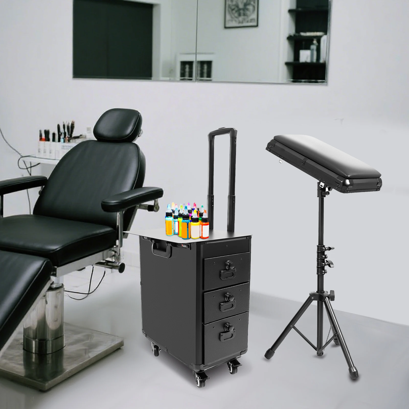Custodia per trucco nera con ruote, tavolo per manicure portatile con rotelle, organizer cosmetico pieghevole, stazione per nail art multifunzione