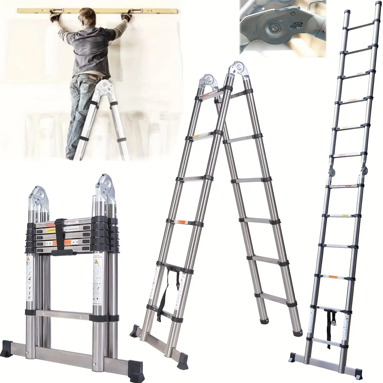 Scala telescopica a forma di A in acciaio inox. Misure: 1.1+1.4m/1.4+1.7m/1.7+2.0m. MAX 150kg, portatile, salvaspazio. Per interni/esterni.