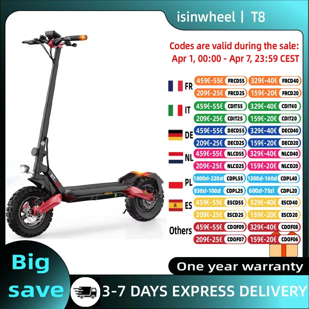 Isinwheel T8 Scooter elettrico per adulti 1200W 48V15Ah Batteria Scooter elettrico pieghevole Pneumatici solidi da 10 pollici Scooter elettrico da città