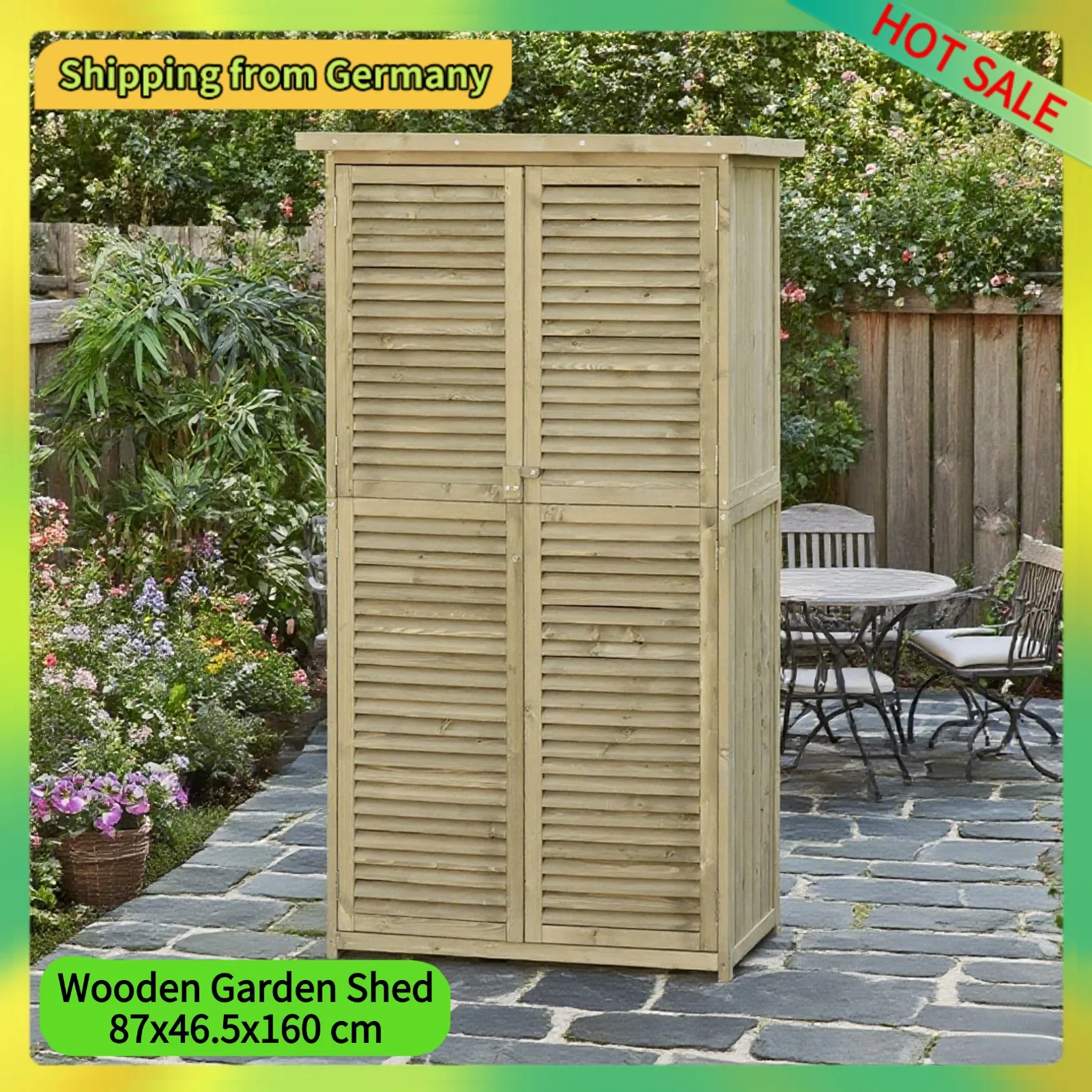 Comanlai Capannone da giardino in legno con anta, 87x46,5x160 cm, armadietto per attrezzi con tetto per asfalto, capannone per attrezzi da giardino con 4 scomparti