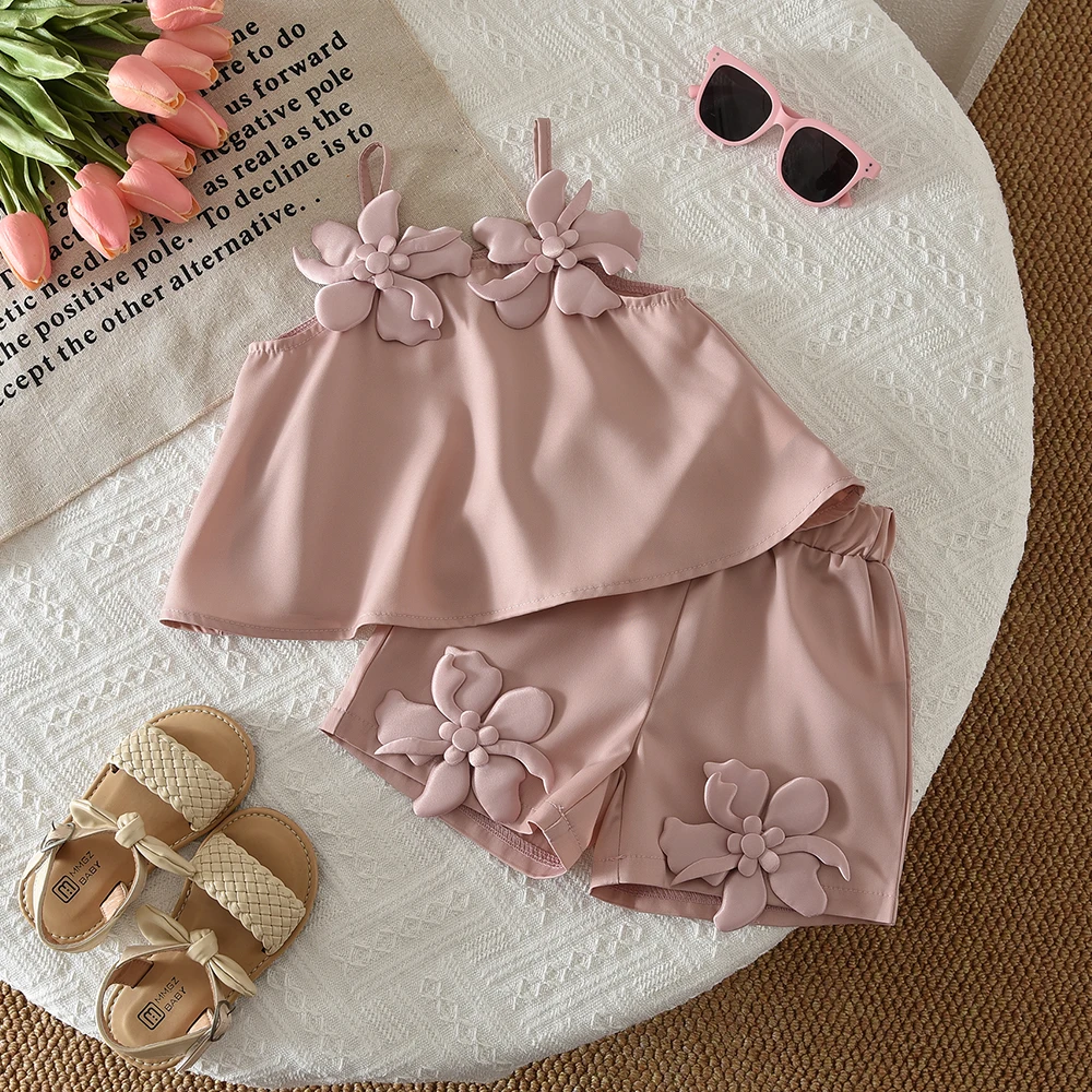 Nuovo Set Estivo di Abbigliamento per Bambina, Top e Pantaloncini Rosa Senza Maniche con Fiori 3D