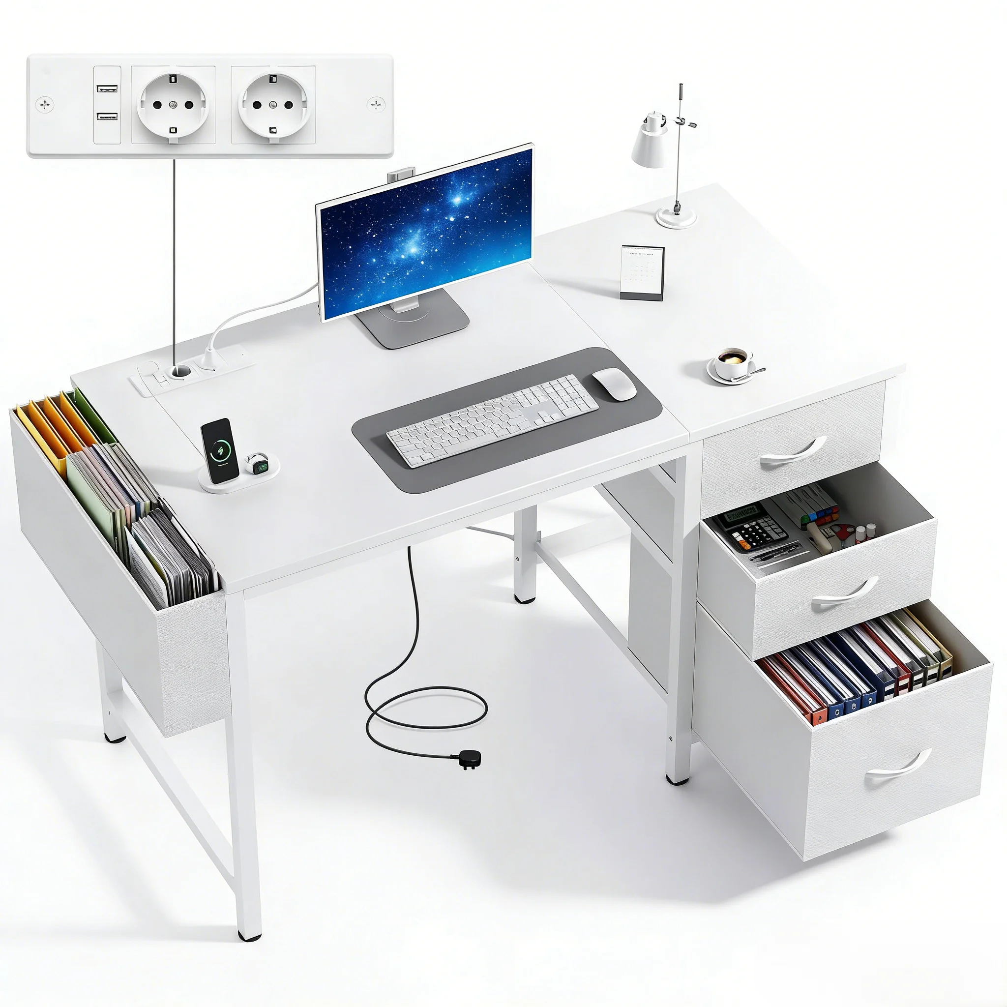 Scrivania Claiks Small in tessuto con 3 cassetti, 2 prese. Tavolo per computer