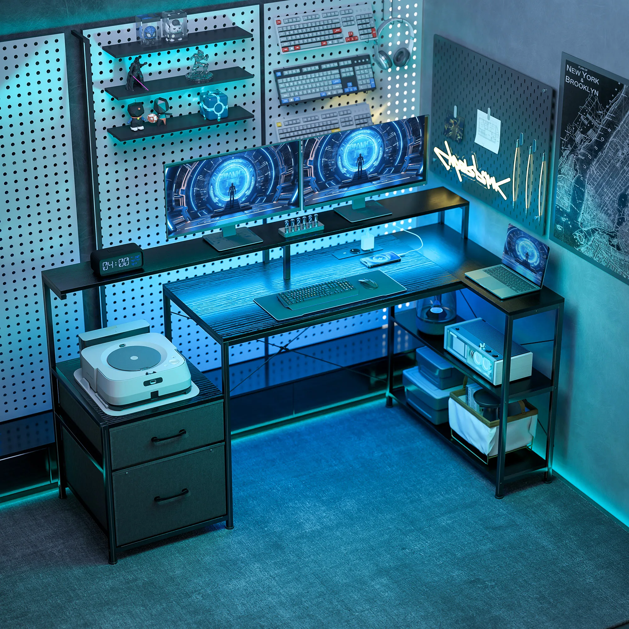 HOMCOM Scrivania Gaming ad L con Multipresa, Luci LED, 165x80 cm Scrivania PC con 2 Cassetti in Tessuto, 2 Scaffali Aperti, Tavolino Laterale e 2 Supporti per Monitor, in Truciolato e Acciaio, Nero