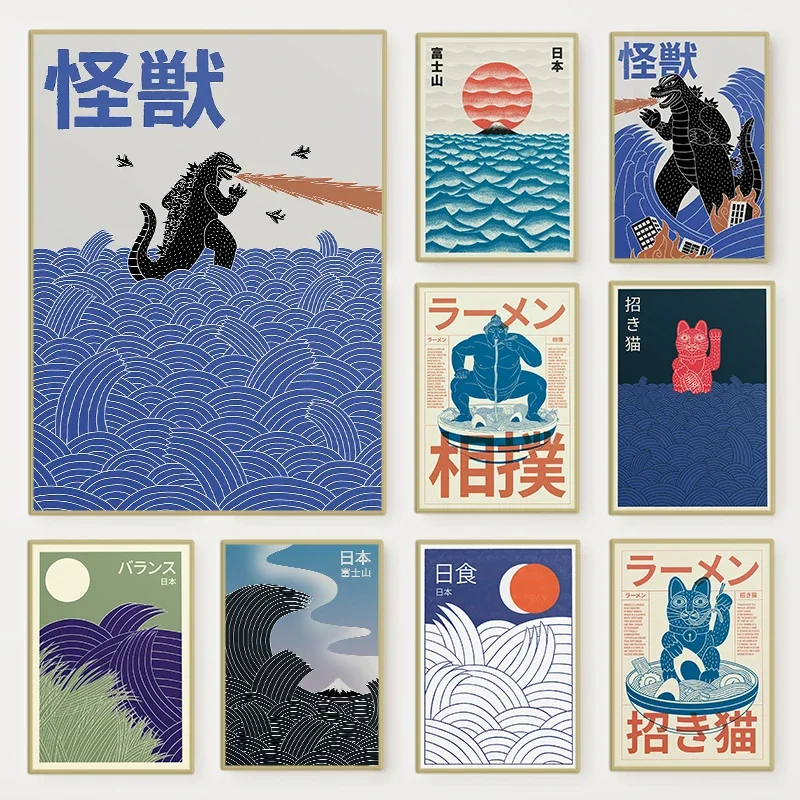 Poster su tela di arte contemporanea giapponese di Tokyo Sunrise Wave Mount Fuji Monster Stampe d'arte da parete per la decorazione domestica del soggiorno moderno