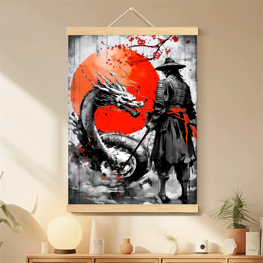 [2D Piatto] 1 pezzo Samurai e Drago Stampa artistica su tela Scroll Guerriero giapponese con motivo sole rosso Ideale per l'home office Facile da appendere