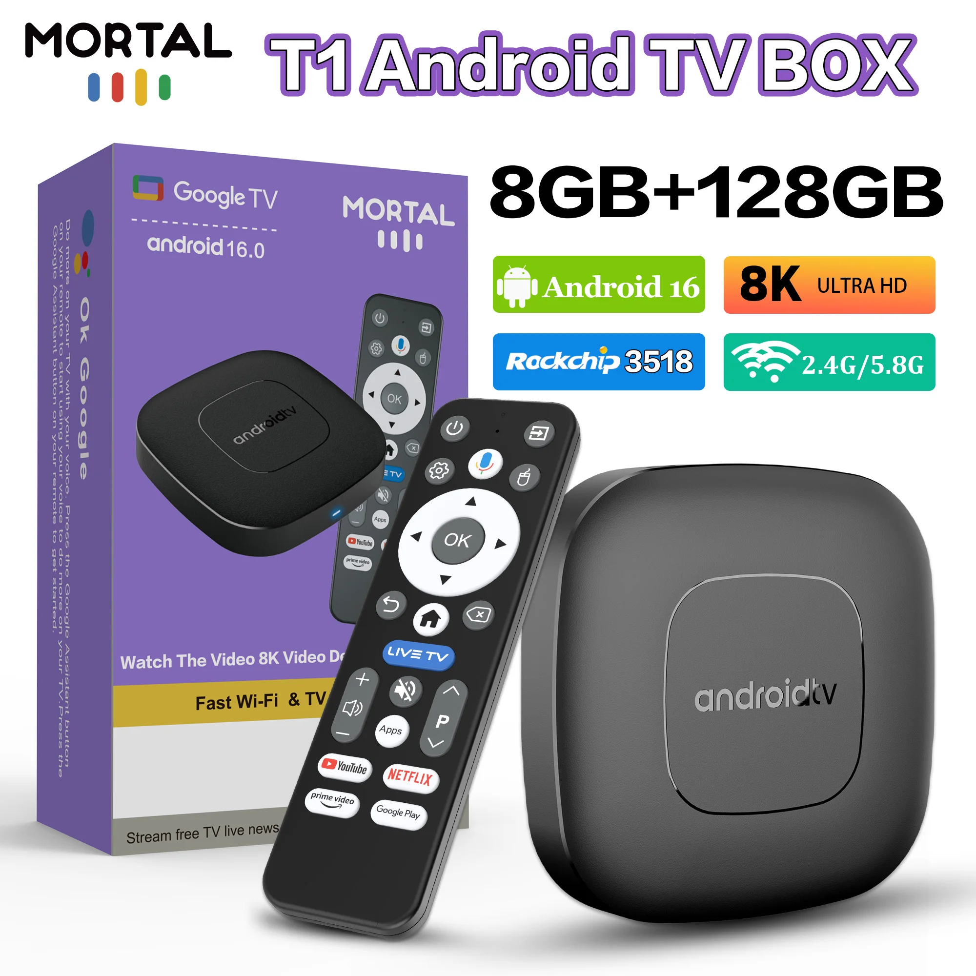 Nuovo Rockchip RK3518 8 GB 128 GB Android 16.0 LVMAO Google Voice Control Youtube Dual UI Wifi6 BT5.4 8K Mortal T1 Smart TV BOX 2026