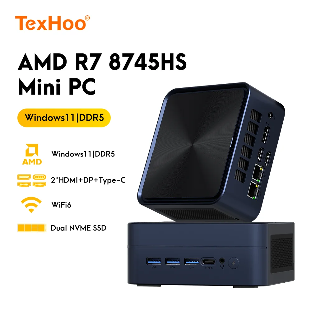 TexHoo Gaming MINI PC con ventola RGB, Desktop da Gaming con AMD R7-8745HS, USB4, 16GB DDR5 RAM, 512GB ROM, Doppio RJ45, BT5.2, WIFI6, Windows 11 Pro, Display 4K