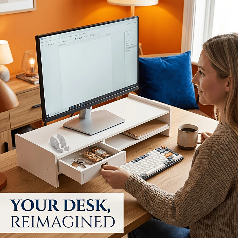Supporto per Monitor Minimalista in PVC Bianco con Cassetto Portaoggetti, Elevatore Ergonomico da Scrivania per Computer, Ufficio e Casa