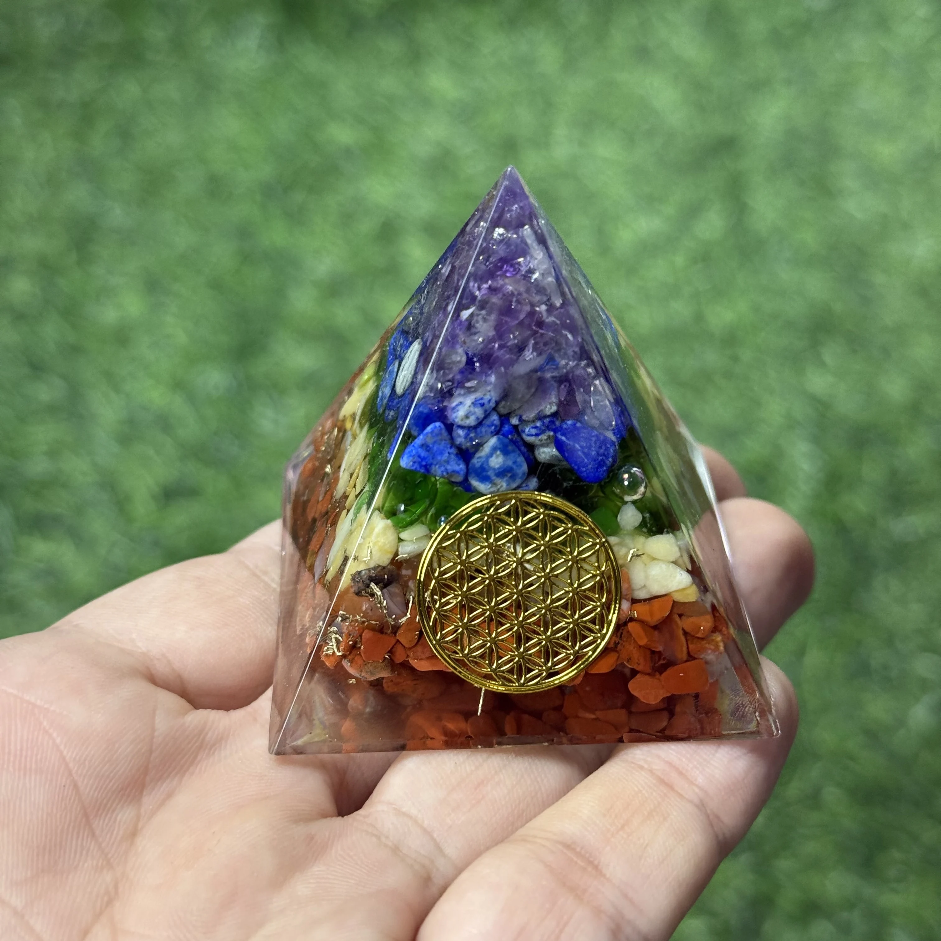 Piramide di orgone in cristallo naturale da 1 pezzo, ornamenti fatti a mano per desktop domestico, pietra preziosa con piramide di orgone con logo fiore della vita