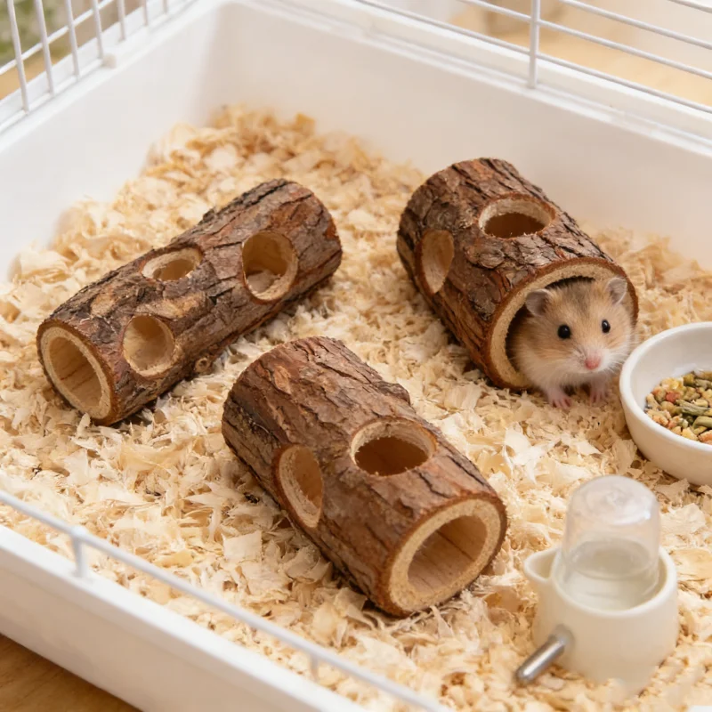 Giocattolo a forma di albero per criceti, in legno di abete, nascondiglio, tunnel, decorazione per gabbia, giocattolo da masticare e per la dentizione per piccoli animali, criceti syriani