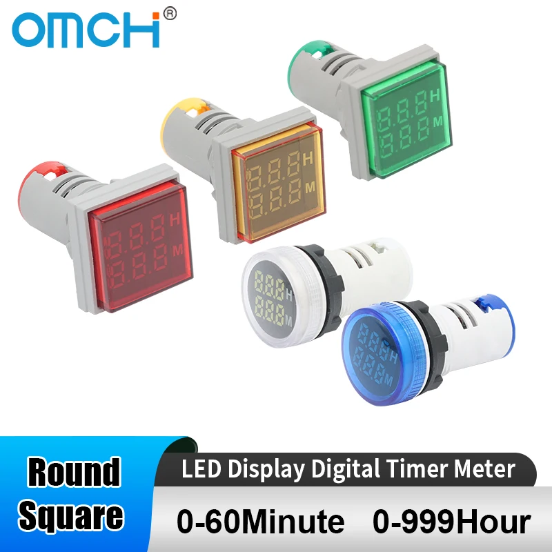 OMCH Misuratore timer digitale a LED quadrato/rotondo da 22 mm 0-60 minuti/0-999 ore AC 220 V-380 V Mini indicatore luminoso di segnale Montaggio su pannello