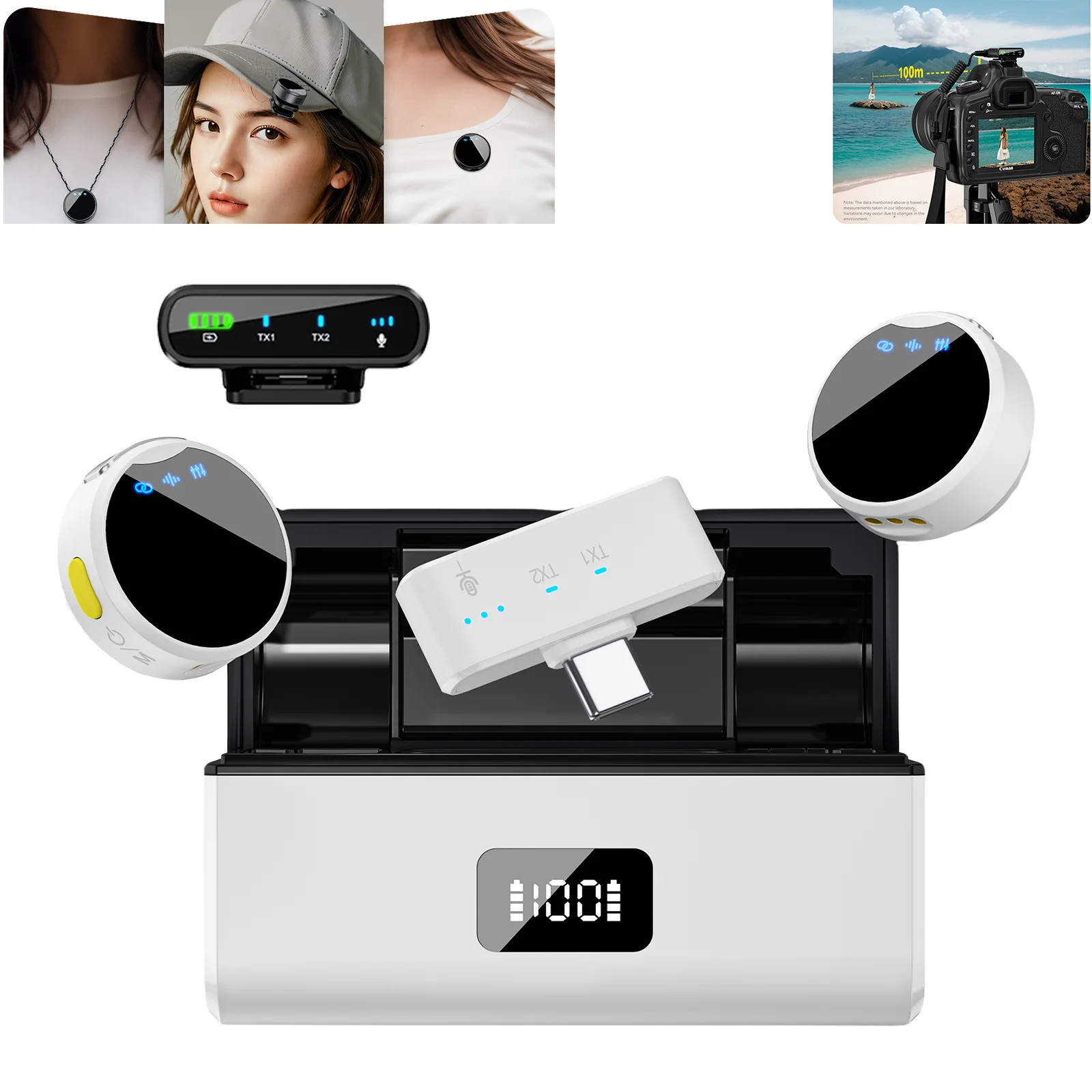 Microfono Lavalier Wireless da 100M per Fotocamera con Cancellazione del Rumore e Scatola di Ricarica, Elettronica Audio Portatile per Registrazione Video