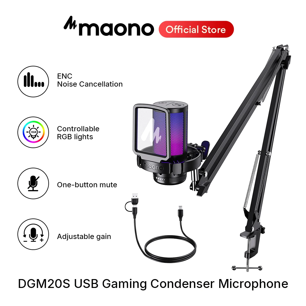 Microfono USB Maono DGM20S, microfono a condensatore RGB con controllo del guadagno e software di riduzione del rumore per gaming e registrazione.
