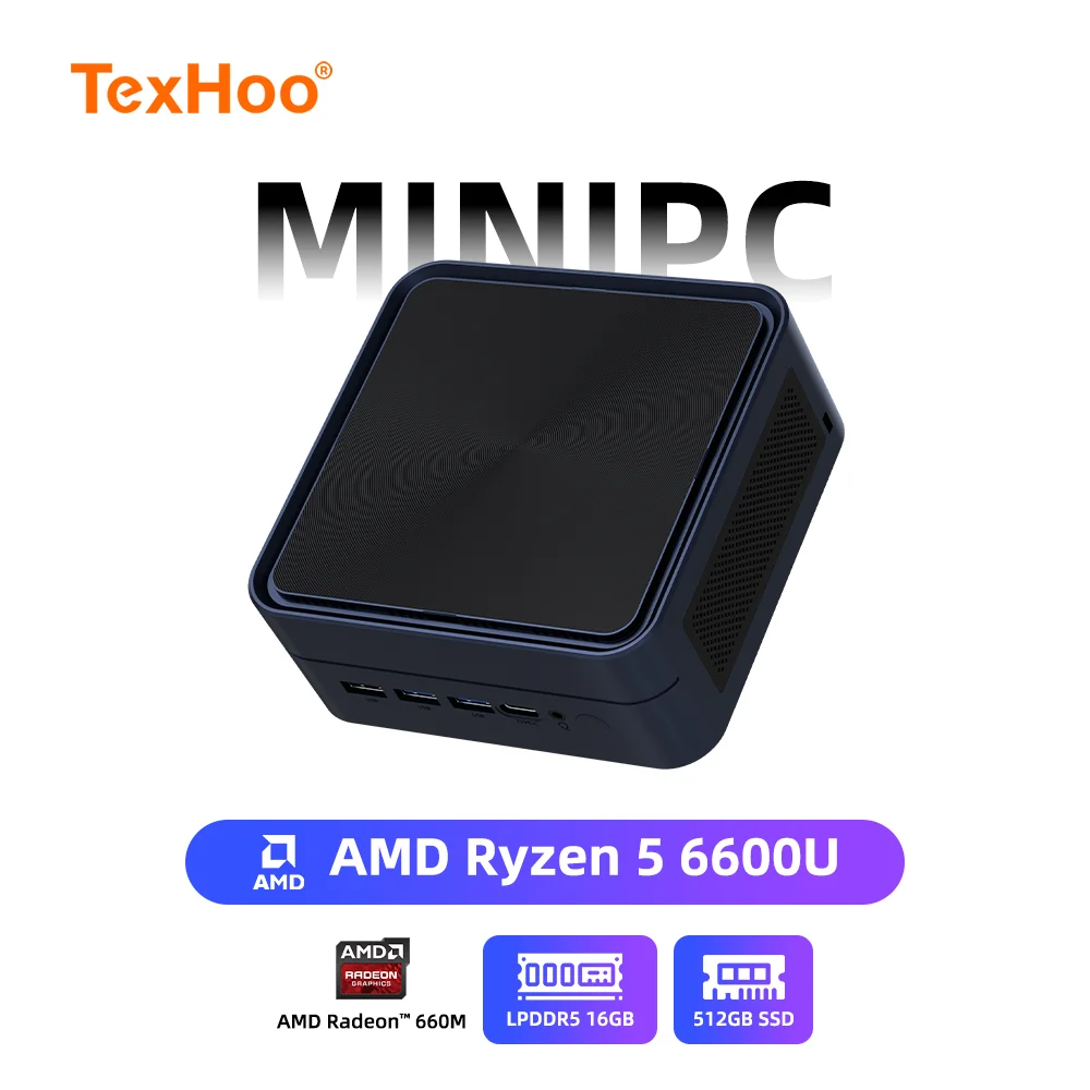 TexHoo AMD Ryzen 5 6600U MINI PC Windows 11 16GB LPDDR5 512GB SSD M.2 2280 PCIE3.0 USB3.2*2 WIFI6 BT5.2 2.6GHz RJ45 1G LAN Gaming Computer PC