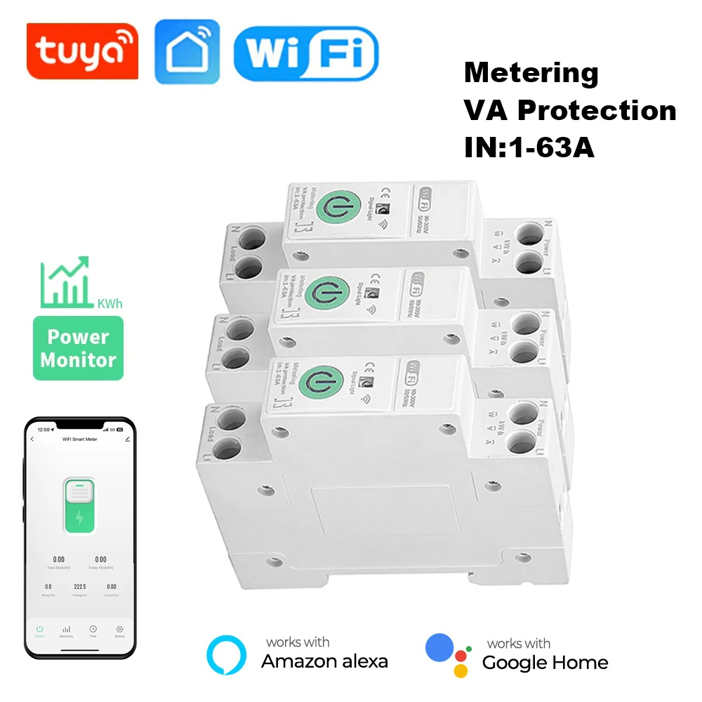 Tuya WiFi Smart Interruttore Interruttore Contatore di energia 1P + N 63A Relè timer MCB Protezione corrente di tensione Voce Alexa Google Home