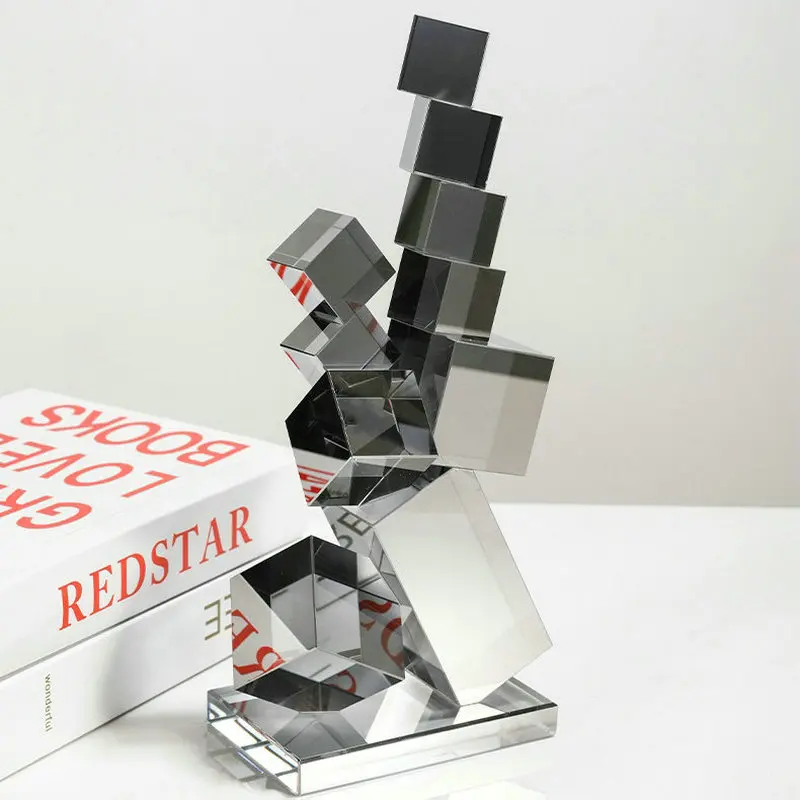 Scultura moderna e creativa per decorazioni da scrivania a forma di alieno, ornamenti decorativi con cubo combinato in cristallo grigio fumo trasparente ZY085BS