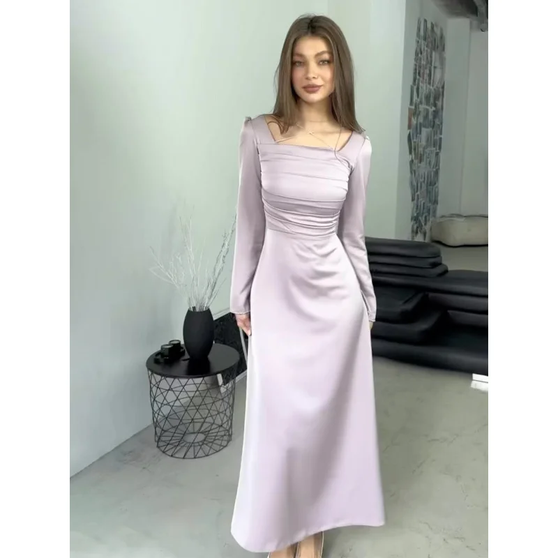 Abito slim aderente in raso a maniche lunghe con cinturino tempestato di diamanti alla moda primaverile europea e americana transfrontaliera 2025
