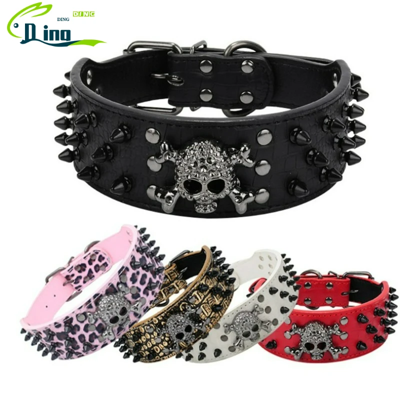 Collare per cani in pelle con borchie a punta larghe 2 pollici, rivetti a proiettile e teschio, accessori per animali domestici per cani di taglia media e grande, Pitbull, Boxer, XS-L