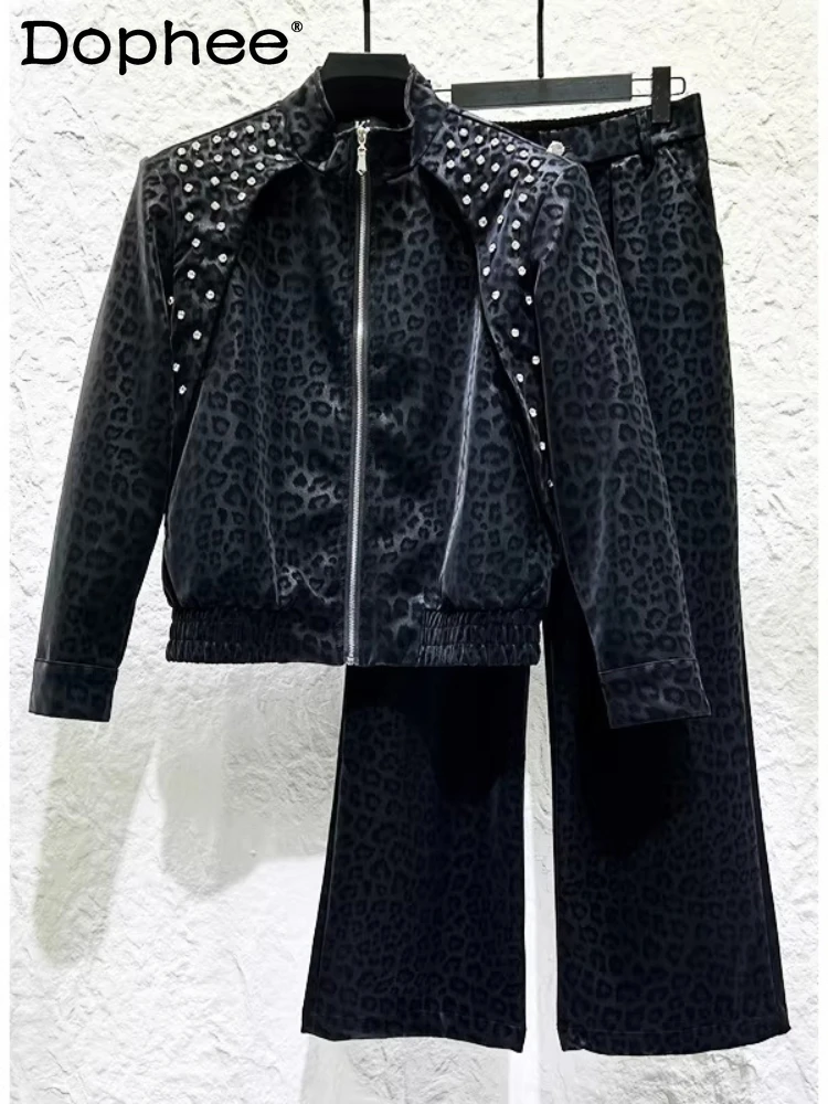 Completo da uomo primavera 2026: Nuovo set due pezzi con giacca a collo alto e pantaloni a gamba dritta, design leopardato con inserti e borchie a diamante