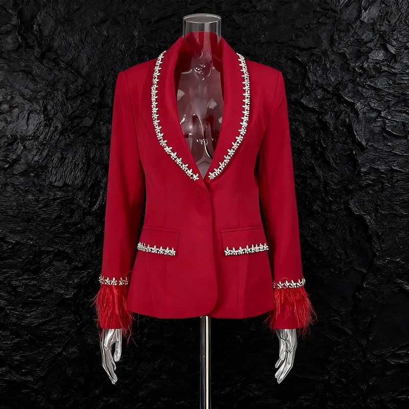 Giacche Blazer con Risvolto Tempestato di Diamanti, Cappotti Eleganti Neri Monopetto, Decorazione in Piume sul Polsino, Lussuosi Soprabiti da Donna