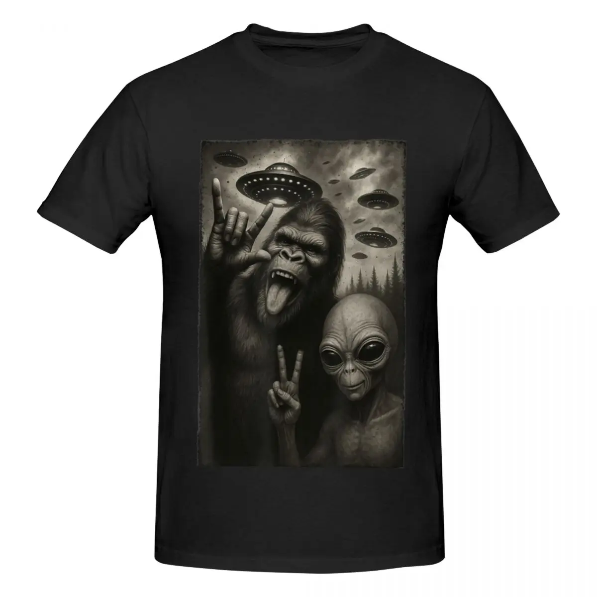 Uomini Divertimento Selfie Bigfoot Alien Sasquatch Rock On Hand Segno UFO T Shirt Streetwear Plus Size O-Collo Manica in cotone Magliette personalizzate