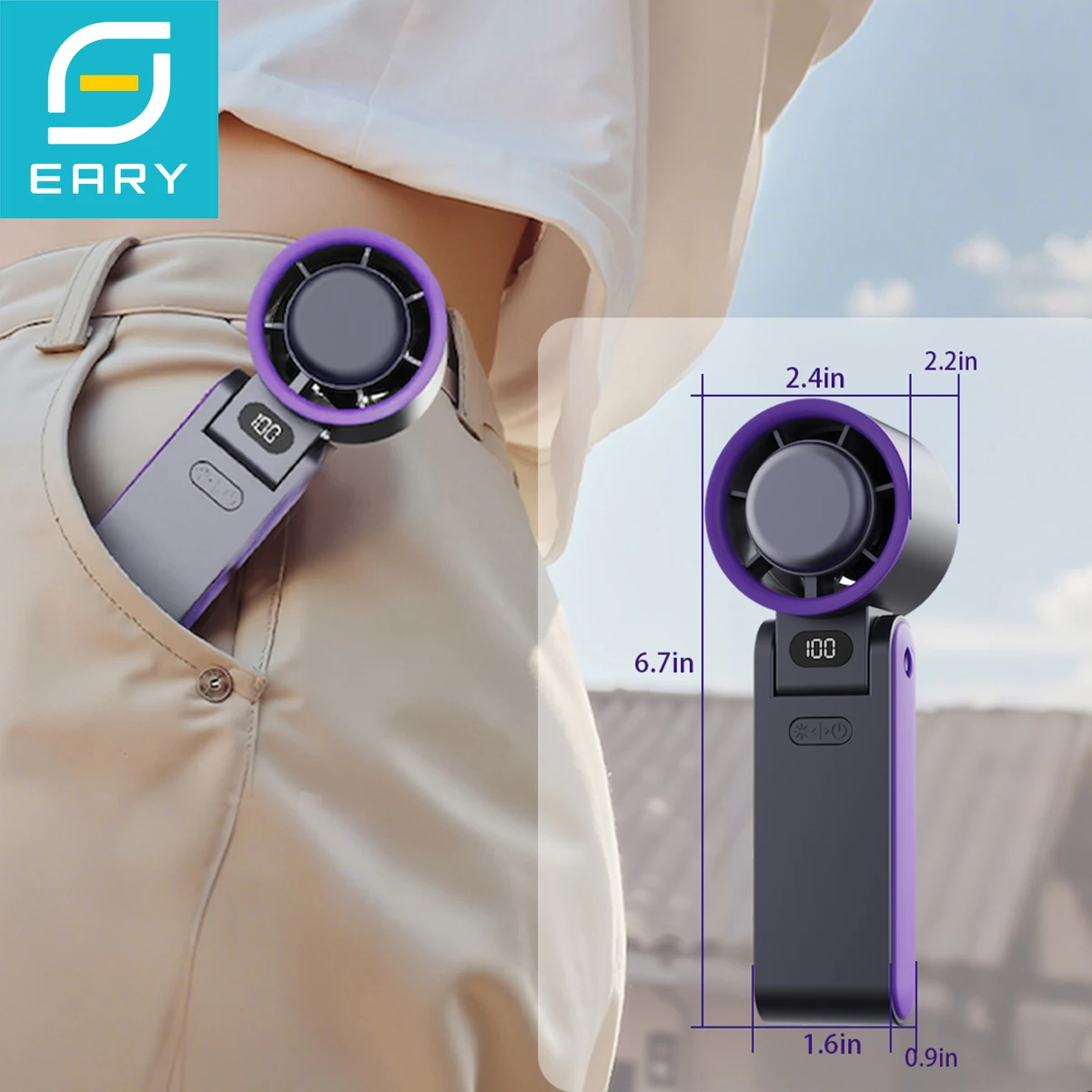 Ventilatore Portatile Eary 3600mAh con 1-100 Velocità, Display LED Digitale, Pieghevole a 90°, Ricaricabile USB, Ventilatore Personale per Regalo