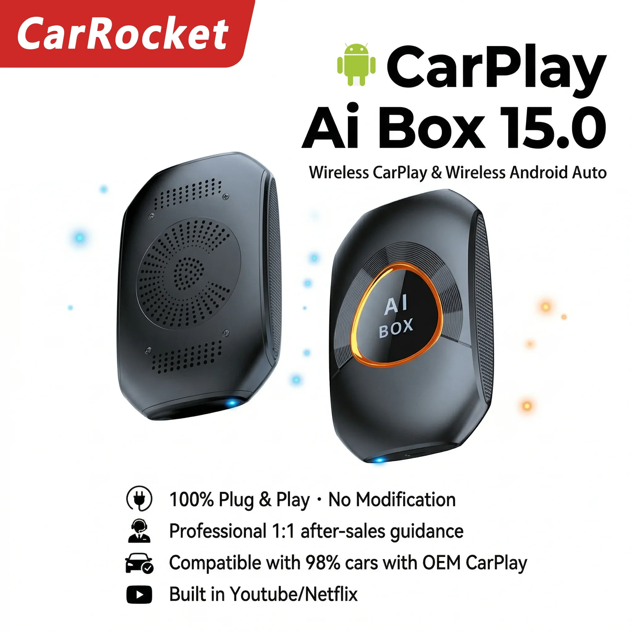 CarRocket Carplay Ai Box, Box Multimediale per Auto con Sistema Android 15, Netflix e YouTube Integrati, Android Auto Wireless e AirPlay