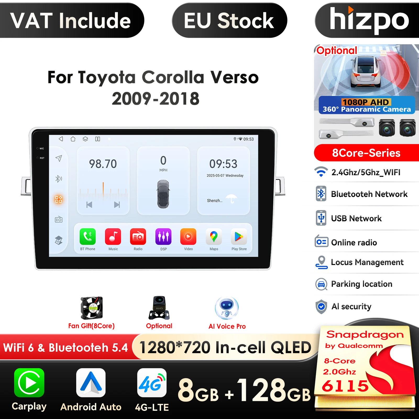 Hizpo 9 pollici Lettore Intelligente Carplay 4G 2Din Android 14 Autoradio per Toyota Corolla Verso 2010-18 Multimedia Video 360 Macchina Fotografica