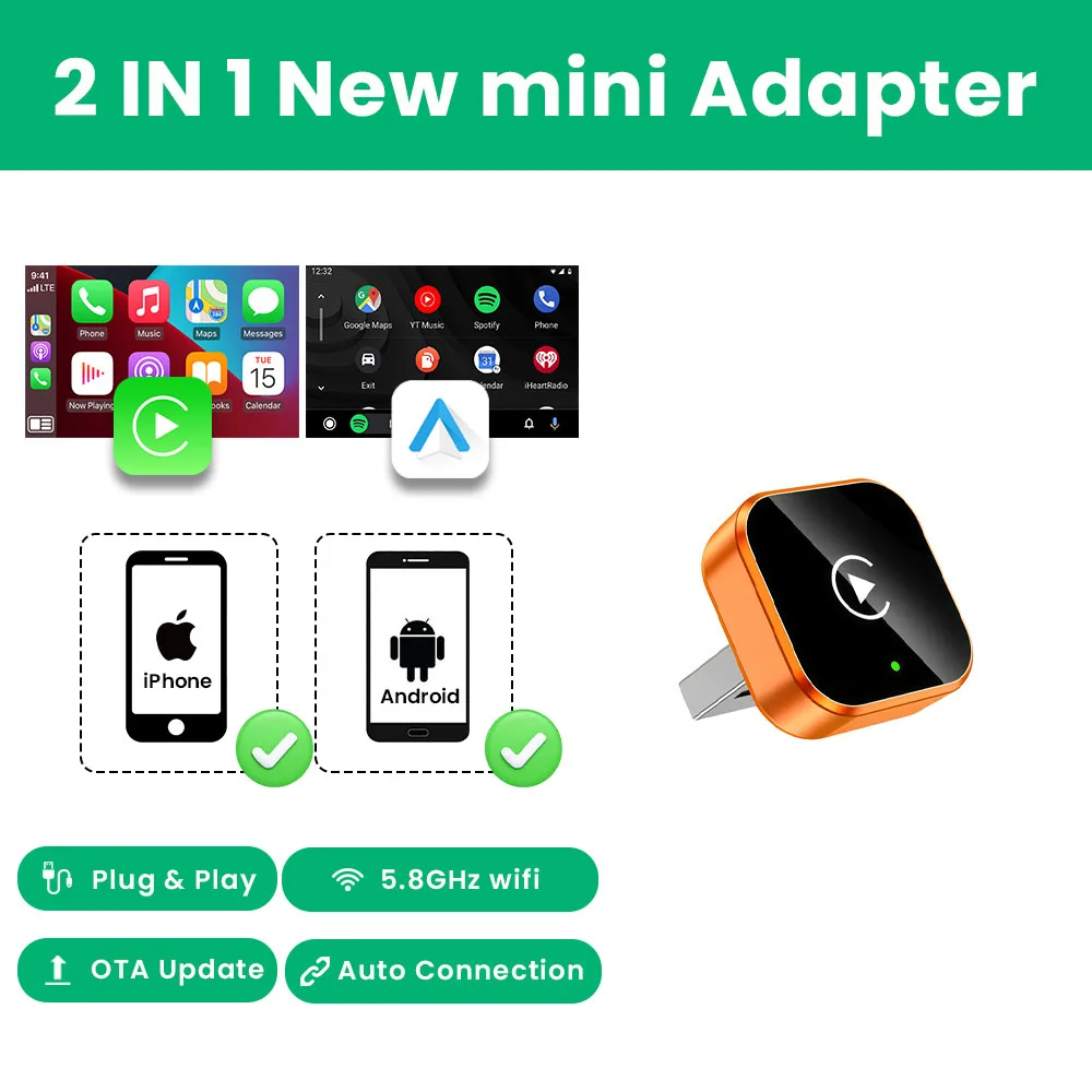 2026 NUOVO Adattatore Wireless 2in1 CarPlay e Android Auto Ultra-Compatto Universale per Auto con CarPlay Cablato di Fabbrica Plug&Play con WiFi e BT
