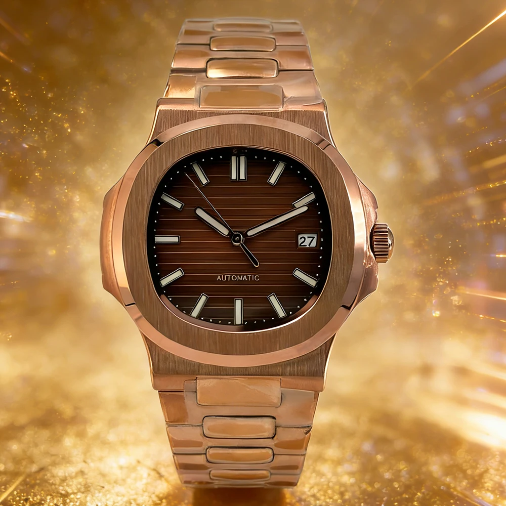 Orologio Meccanico Automatico da Uomo, Movimento Giapponese NH35, Cassa Impermeabile in Oro Rosa, Vetro Zaffiro, Cinturino in Gomma Casual, Orologio Business