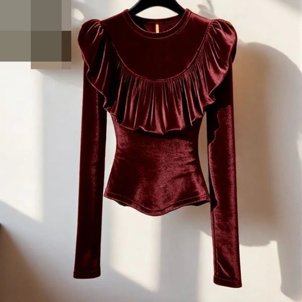 Camicia in velluto bordeaux Kink dal design in stile Hong Kong. Camicia base di fascia alta fredda per sorella reale femminile