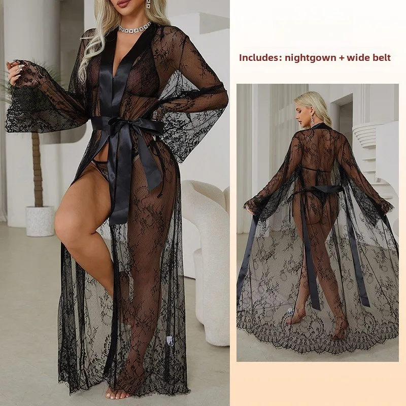 Set da 2 pezzi da donna sexy in pizzo camicia da notte vestaglia set lingerie trasparente indumenti da notte scollo a V manica lunga homewear con cintura larga