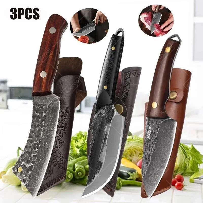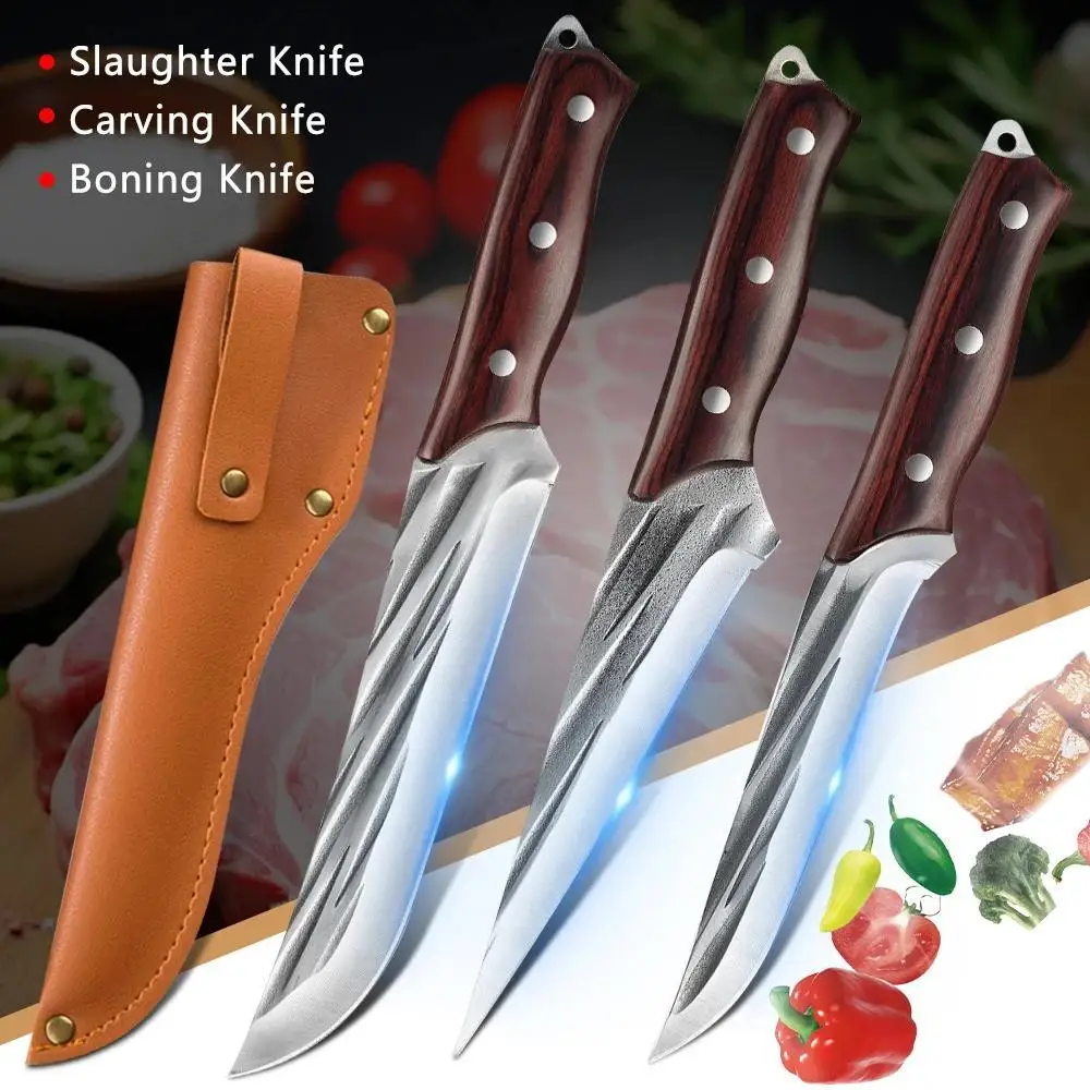 Coltello da frutta forgiato fatto a mano da 3 pezzi Coltello da cucina professionale per chef Coltello multiuso per disossare in acciaio inossidabile con fodero per cucinare