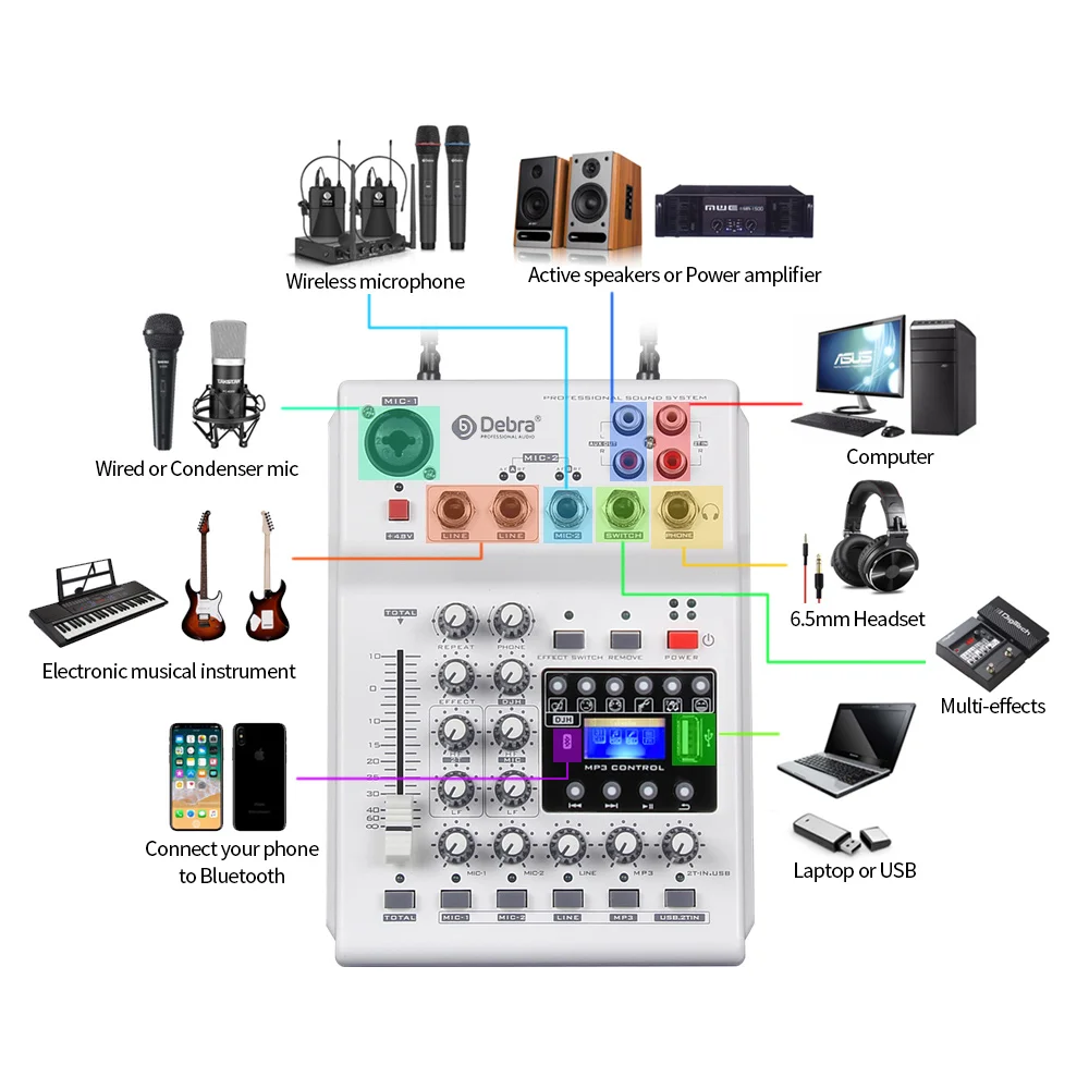 Debra Pro 6 canali DJ Controlle con 99DSP Reverb Effect Bluetooth 5.0 USB Mixer USB per Karaoke PC registrazione condensatore Mic
