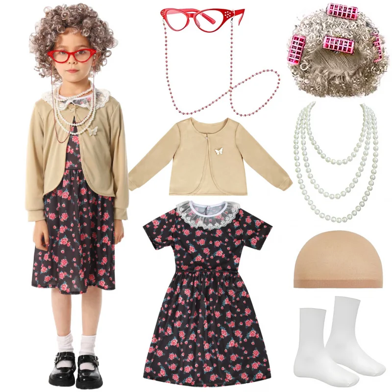 Costume cosplay per ragazze, 100 giorni di scuola, per bambini, vecchia signora, nonna, vestito da 100 ° anno, spettacolo teatrale, Halloween