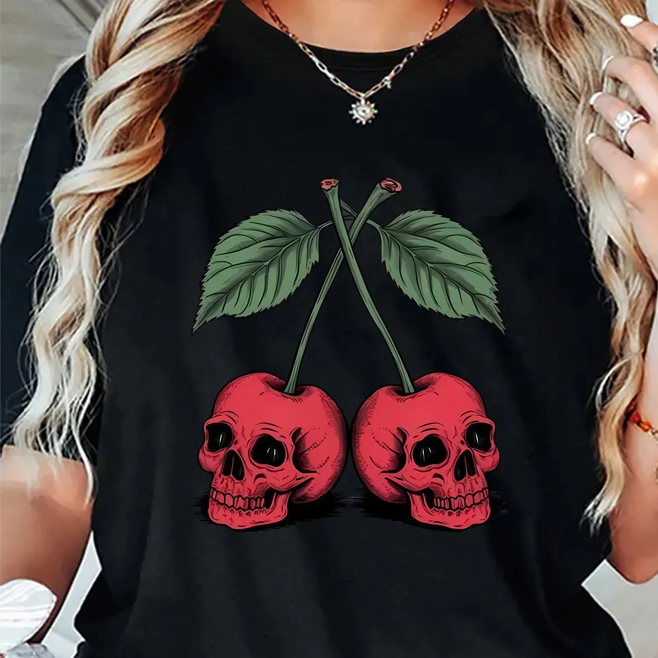T-shirt Minimalista da Donna con Motivo Teschio e Ciliegie Horror, Manica Corta, Vintage, Manga Corta