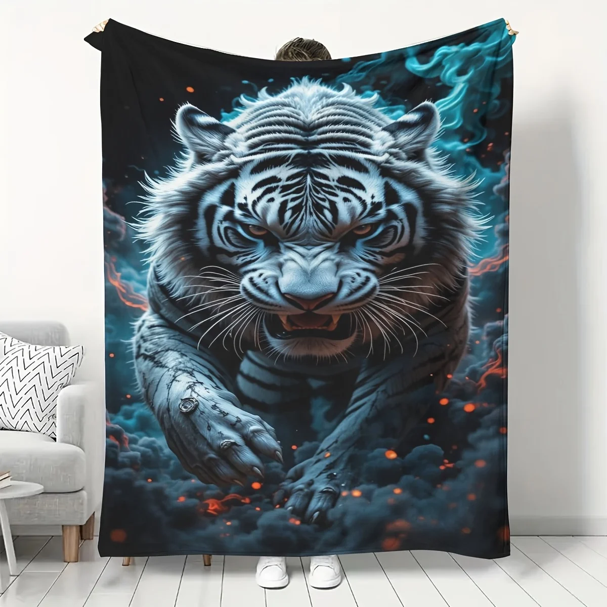 Coperta stampata in flanella con motivo tigre bianca con occhi illuminanti adatta a tutte le stagioni adatta per divani da ufficio e viaggi