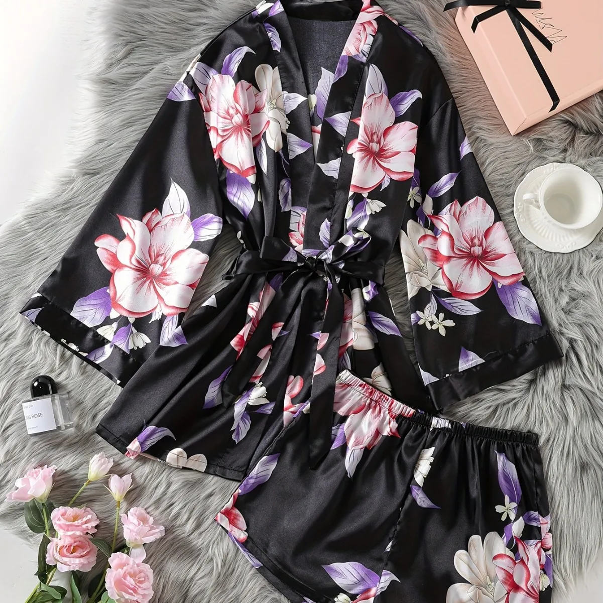 Vestaglia Sexy da Notte Femminile in Seta Simulata, Kimono con Motivi Floreali, Cardigan da Mattina, Accappatoio