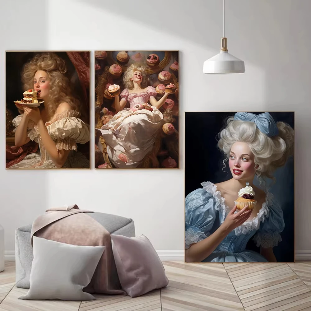 Vintage elegante rococò donne mangia dessert torta poster rinascimentale stravagante stampe immagini murali su tela casa soggiorno arredamento